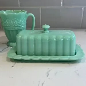 #pioneerwoman #farmhousekitchen #greenglass #butterdish #kitchendecor