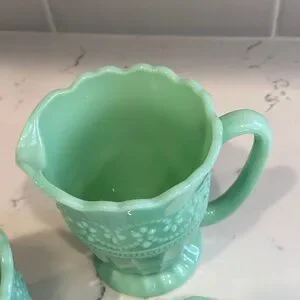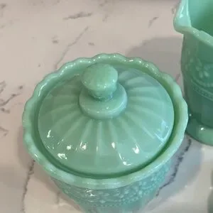 Pioneer Woman, mint green glass, butter dish, creamer sugar set, farmhouse kitchen, cottage decor