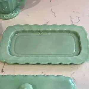Pioneer Woman mint green glass serving set including covered butter dish with tray, creamer, and lidded sugar bowl. Glossy pressed glass with scalloped edges and ribbed sides in a farmhouse-style design. Modern Pioneer Woman kitchenware—perfect for everyday use, gifting, or cottage-style décor. All pieces in excellent condition with no chips or cracks.