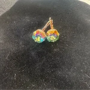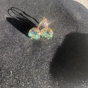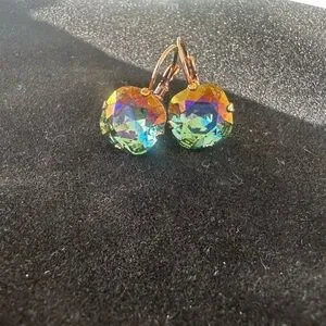 12 mm cushion cut rhinestones earrings set in rose gold lever backs with shades of sea green and rainbow toned highlights. Loved them but just too big for me