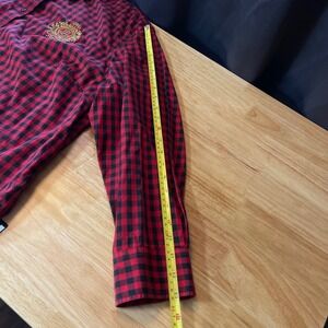 Embrace classic charm with this LAUREN Ralph Lauren button-down shirt. The bold red and black gingham pattern is elevated by a stunning embroidered crest on the chest, featuring intricate gold detailing and regal lettering. This shirt offers a comfortable yet stylish silhouette perfect for layering or wearing on its own. Imagine yourself rocking this piece for a casual weekend outing, a relaxed day at the office, or even a stylish brunch.