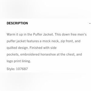 Sleek and warm puffer jacket. Features iconic logo detail. Ideal for cold weather. Black. Men’s size large. Brand new with tags. This is a thinner coat but still very nice materials and will keep you warm but not thick or bulky.