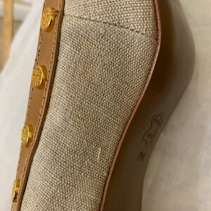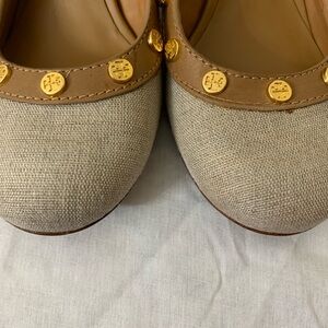 Chic Tory Burch heels in gray and tan. Adorned with gold studs for a stylish touch.