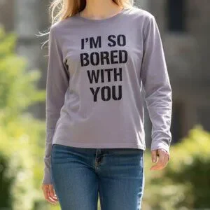 Signature Juicy Couture long-sleeve graphic tee in a soft lavender (can look a lavender/grey) shade with bold black lettering: “I’M SO BORED WITH YOU.” Fitted silhouette with extended cuffs and comfortable stretch. A true Y2K statement piece.