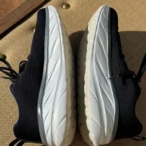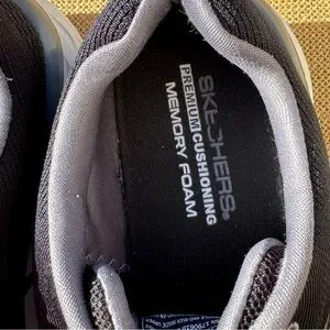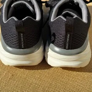 Sleek Skechers sneakers in black. Features cushioned white sole and lace-up design. Engineered Mesh Upper: The upper part of the shoe is a breathable black mesh material