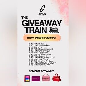 Join the exciting Giveaway Train event on Friday, January 30th at 1:45 PM PST. Don't miss out!