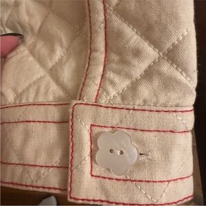 Stay stylish and cozy with this cream quilted jacket featuring a charming pink trim. Perfect for adding a touch of elegance to your wardrobe. Only worn 2-3 times so in great condition