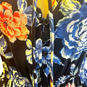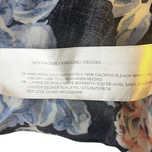 Large floral pattern in shades of blue, pink, and white on a navy background