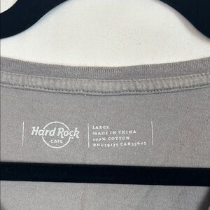 Gray V-neck tee with striking red graphic. Features iconic Hard Rock Cafe design. Ideal for casual wear.