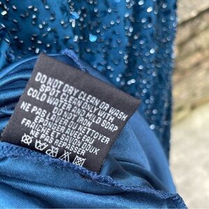 Elegant navy dress with sparkling sequins. Features a stylish cold shoulder design.