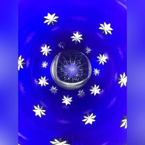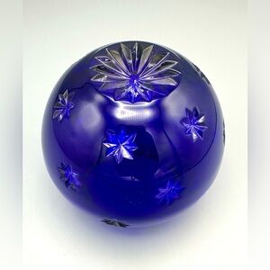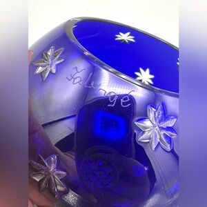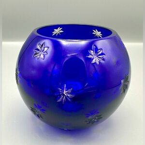 A bold and beautiful Fabergé crystal votive holder in deep cobalt blue with sparkling cut star details. Thick, high-quality crystal that catches the light beautifully — especially when illuminated.