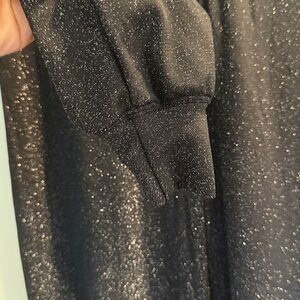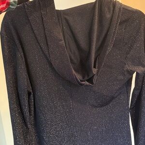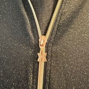 Soft, shimmery lurex knit Black with silver metallic Rose gold tone zipper front Hooded
