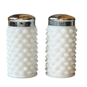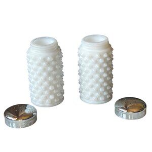 This vintage pair of hobnail milk glass salt and pepper shakers features a classic design with metal lids. They stand 3 inches tall.