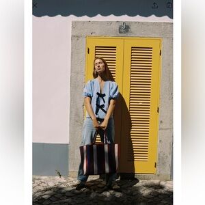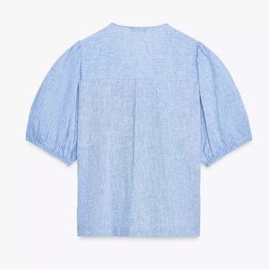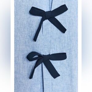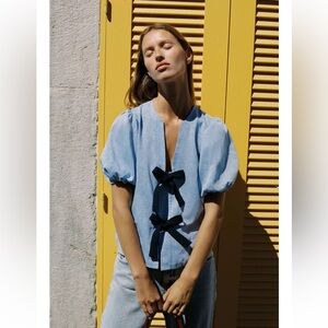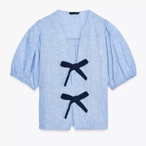 Zara Denim Navy Blue Bow Linen Blouse - NWT