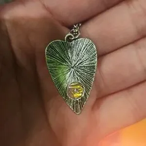 Ouijia Board planchette design necklace. YES. Has opal looking material in circle opening for an iridescent look. From Hot Topic