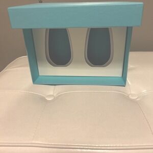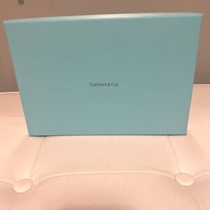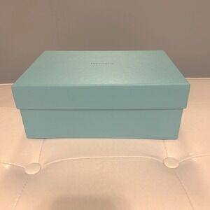 The product is an empty large Tiffany & Co gift box made of blue paper/cardboard. It is rectangular in shape, measuring approximately 10"x 7"x 4". The box is designed for storage and gifting, featuring stackable functionality. Cardboard cut outs meant for wine glasses. But could probably be removed if desired. Excellent condition.