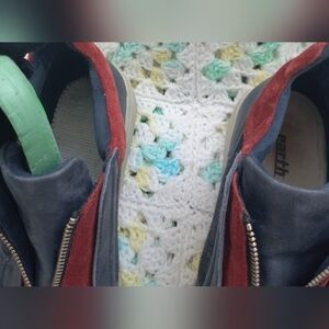 a pair of Earth Zane front-zip sneakers, featuring a navy and red color scheme with a zipper closure.