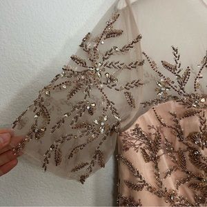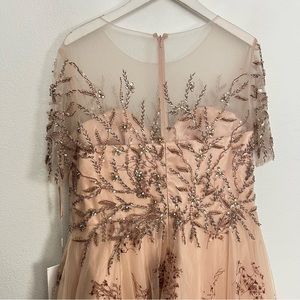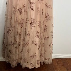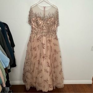 Elegant nude maxi dress with intricate embroidery. Ideal for formal occasions. Features a graceful silhouette.
