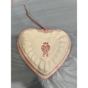Vintage Hartstone stoneware heart-shaped cake or jello mold featuring a pink spongeware border and raised heart design. This versatile piece includes a hanging hole with leather tie, allowing it to be used as charming wall décor when not in use.