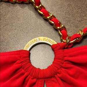 Bold red bikini with gold accents. Elegant design for beach outings. Comfortable and stylish.