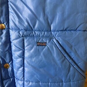 Bold orange and blue puffer vest. Ideal for outdoor adventures. Embossed buttons. Size large. In great condition!