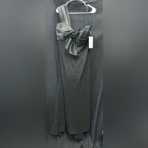 Looking to achieve siren status? Enjoy your starring role as best-dressed in this divine mixed-media gown. Cut from smooth fabric in a sleek, body-skimming silhouette, the dress is accented with a single satin shoulder and pleated bow bodice. It’s punctuated by a sweep train.
