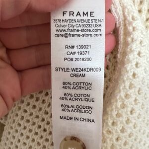 Effortlessly chic and beach-to-brunch ready, this FRAME Crochet Midi Kaftan is the ultimate elevated swimsuit cover-up. Crafted in a breathable cotton-blend open knit, this cream midi features ribbed trim, a button-front silhouette, and tasseled tie details for a relaxed yet refined coastal look. Perfect layered over swimwear or styled with a slip for resort evenings.