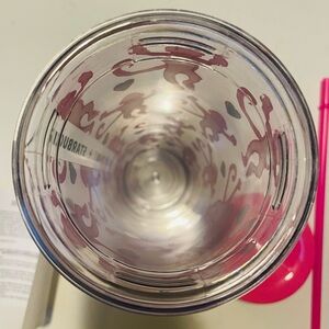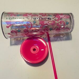 • Design: The clear plastic cup features an all-over print of pink monkeys and small teal hearts, with a bright pink lid and a matching reusable straw.