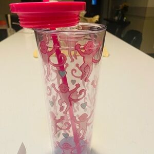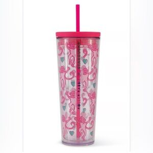 Vibrant pink tumbler with playful monkey design. Accented with teal hearts. Includes matching pink straw.