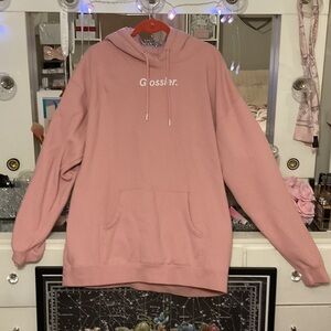 Soft blush pink hoodie with Glossier logo. Includes front pocket and drawstring hood.