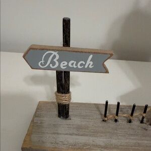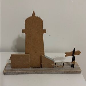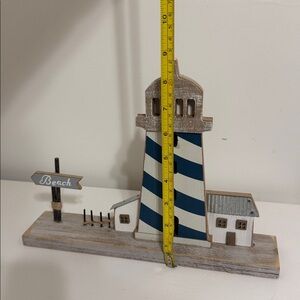 Charming lighthouse decor with blue and white stripes. Features a small house and 'Beach' sign. Perfect for coastal-themed spaces.