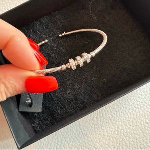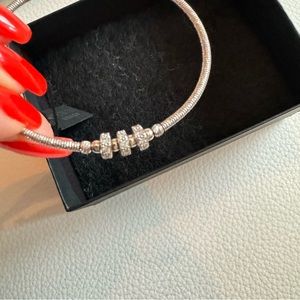 Elegant silver bracelet featuring sparkling crystal accents. Perfect for adding a touch of sophistication to any outfit.