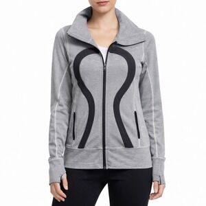 Lululemon Athletica grey striped full zip jacket. This athletic zip-up features the iconic Lululemon logo detailing, contrasting black trim, and thumbholes for added comfort and versatility. Two zippered pockets offer convenient storage. Perfect for workouts, casual wear, or travel.