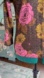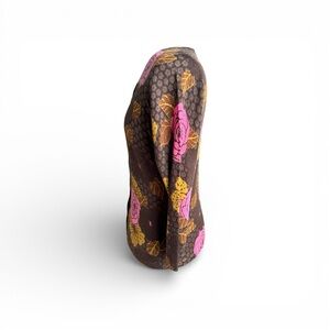 Elegant cardigan with bold floral design. Features pink and gold accents on a brown base. Ideal for stylish layering.