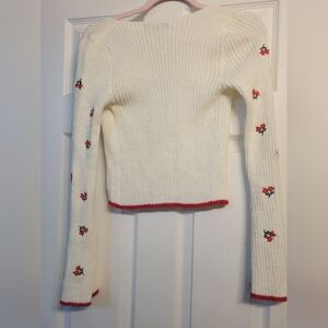 Elegant cream knit cardigan. Soft texture and stylish design.Introducing a perfect spring look like the Lulus Tanvi Ivory Floral Embroidered Tie-Front Cardigan will inspire you to create so many cute ensembles! This stretchy ribbed knit cardigan features cutesy floral embroidery throughout as it shapes long sleeves, a V-neckline, and a slender tying strap that secures the open-front. Contrasting red trim accents the slightly cropped hem and cuffs, completing the look.