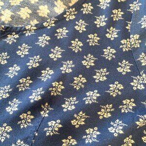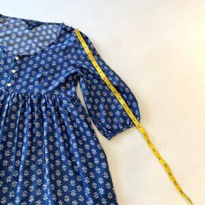 Sweet and stylish, this Polo Ralph Lauren dress is a wardrobe classic. It features a soft blue fabric with delicate white floral print, a scoop neckline, and three white buttons down the front. The gathered waist creates a flowy silhouette, while the puffed ¾ sleeves with elastic cuffs add a touch of vintage charm.
