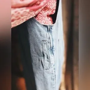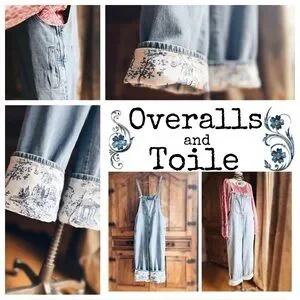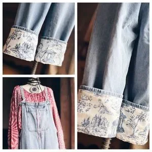OOAK Light wash overalls with two side pockets, two back pockets , side zip and adjustable tie bib in front. The hemline has a unique detail of blue and white toile fabric. And can be cuffed at 3” or 6” size runs like a M / L 19” across waist . Inseam can be 19” or 21” depending how you roll the cuff. Artisan created by me . Necklace is listed separately and blouse has sold .
