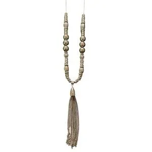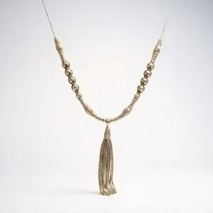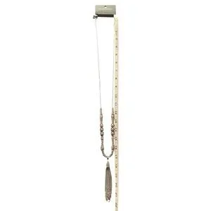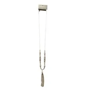 Chic silver necklace with beaded design. Features an elegant tassel accent. Long drop. Ideal for elevating any look.