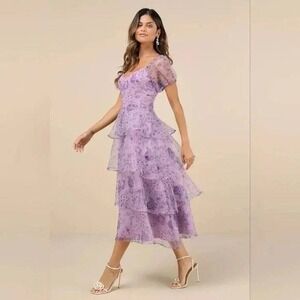 Lulus Lulu's Oh-So Stunning Purple Floral Organza Tiered Midi Dress Size M