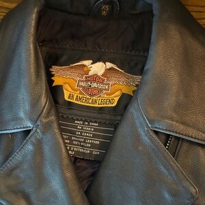 Classic black leather jacket with bold fringe accents on sleeve. Features zippered pockets and a sleek design.