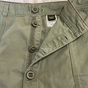 This knee-length A-Line skirt by Eddie Bauer offers a sleek and versatile look in a muted Khaki green shade, perfect for both casual and work settings. Its classic silhouette ensures a timeless appeal, making it an essential addition to any wardrobe. 100% Cotton, cute full button down , cargo style front pockets, two pockets on backside, stitched seams, vintage Eddie Bauer but timeless design.