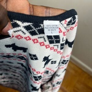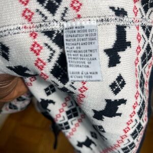 Charming sweater with black dog motifs. Accented with red geometric designs.