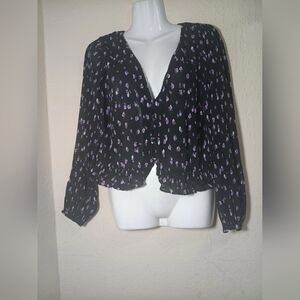 Chic black blouse with a pink floral pattern. Flattering fit and stylish design. Measures 20 inches from armpit to armpit, 20 inches in length, and 23 inches in sleeve length.