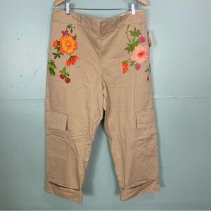 Anthropologie Embroidered Cargo Pants Floral Warm Wheat Beige 1X