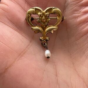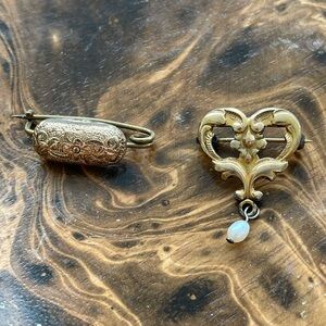 Beautiful set of small Antique Victorian Edwardian brooches. One heart-shaped brooch with a small natural pearl drop. Back of heart brooch has 'GF & STER' marking. GF has worn off the back.
