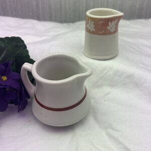 Add a charming touch to your home with this ceramic pitcher duo. Featuring a lovely pink and white design, these pitchers are perfect for both decor and serving purposes. Duraline Creamer England (leaves)