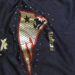 New England Patriots jersey in size medium. Navy and white with red sequins and laces at the neckline.