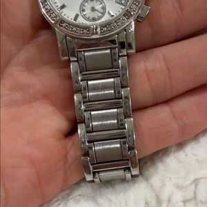 Stylish Bulova watch with a silver-tone finish. Features a chronograph design and sparkling accents. Ideal for any occasion. Just needs battery