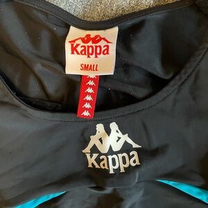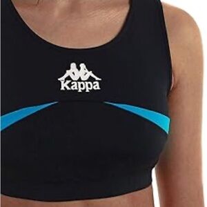 Stylish Kappa sports bra in black with blue accents. Perfect for workouts.
