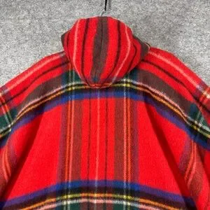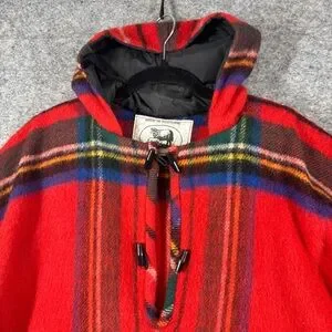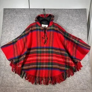 • Classic red tartan plaid, attached hood, toggle neck closure, snap details at sides, fringe hem, unlined interior